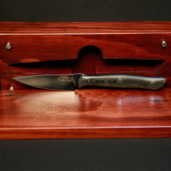 This kitchen utility knife is part of the C.A.P. collection. It features a 3 1/2 inch blade made from premium CPM-154cm steel with a mirror polish. The handles are made from black linen Micarta and bolted as well as glued into place for long-lasting durability.